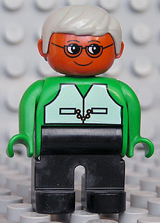 Duplo Figure - Male, Adult Man, Black Legs, Green Top with Vest Pattern, Gray Hair, Dark Orange Head (75511) |
