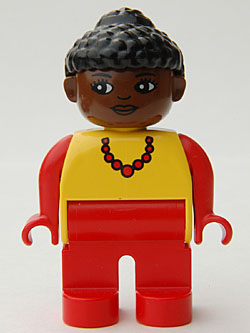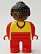 Duplo Figure, Female, Red Legs, Yellow Top with Red Necklace, Black Curly Hair in Bun, Brown Head |