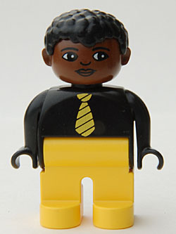 Duplo Figure, Male, Yellow Legs, Black Top and Yellow Striped Tie, Black Curly Hair, Brown Head |