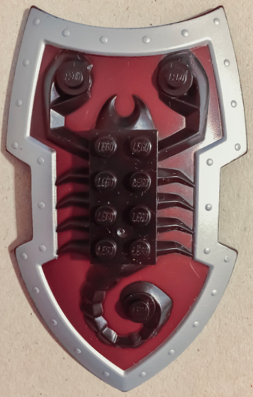 Large Figure Shield, Knights Kingdom Lord Vladek with Scorpion on Dark Red Background and Silver Border Pattern |