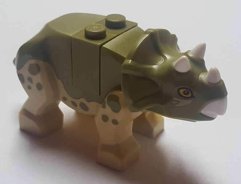 Dinosaur Triceratops Baby with Fixed Olive Green Top with Molded White Horns and Beak and Printed Bright Light Orange Eyes and Olive Green Spots Pattern |