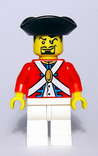 Torso Pirate Captain Jacket Open with Gold Trim and Red Pockets over Red Shirt, White Ascot Pattern / Black Arms / Pearl Gold Hook Left / Yellow Hand Right |