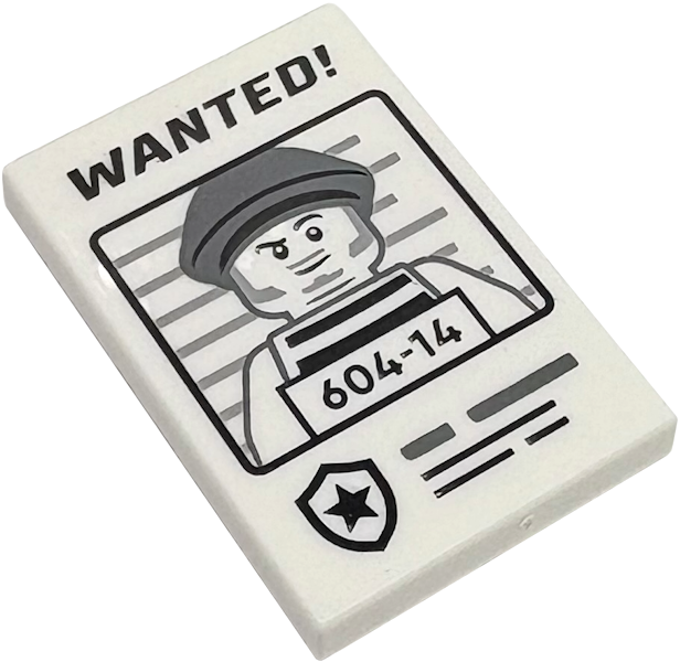 Tile 2 x 3 with Black 'WANTED!' and Dark Bluish Gray Minifigure with '604-14' Pattern |
