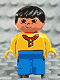 Duplo Figure, Child Type 1 Boy, Blue Legs, Yellow Top with Buttons and Red Collar, Black Hair, Grin |