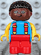 Duplo Figure, Child Type 1 Boy, Red Legs, Blue Torso with 2 Straps, Yellow Arms, Brown Head with Black Curly Hair |