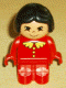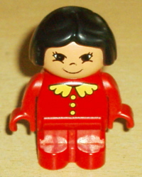Duplo Figure, Child Type 1 Girl, Yellow Legs, Red Top with Lace Collar & Buttons, Yellow Arms, Black Hair, Brown Head |