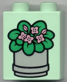 Duplo, Brick 1 x 2 x 2 with Potted Plant with Green Leaves, Pink Flowers, and Light Gray Pot Pattern |