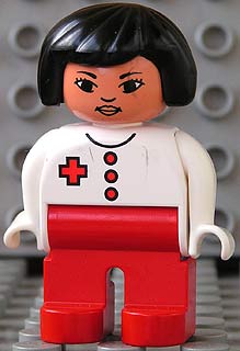 Duplo Figure, Female Medic, Red Legs, White Top with Red Buttons and Cross, Black Hair, Lips |