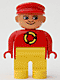Duplo Figure, Male, Black Legs, Red Top with 2 Yellow Buttons, Red Cap |