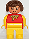 Duplo Figure, Female, Red Legs, Yellow Top with Red Buttons & Wrench in Pocket, Brown Hair, Turned Down Nose |