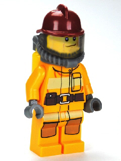 Fire - Bright Light Orange Fire Suit with Utility Belt, Dark Red Fire Helmet, Yellow Air Tanks, Black Eyebrows, Chin Dimple |