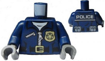 Torso Police Jacket with White Undershirt, Zippers, Gold Badge and Buckle with 'POLICE' Pattern on Back / Dark Blue Arms / Dark Bluish Gray Hands |