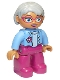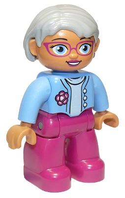Duplo Figure Lego Ville, Female, Magenta Legs, Medium Blue Top with Flower, Light Bluish Gray Hair, Blue Eyes, Glasses, Oval Eyes (6210308 / 6273481) |