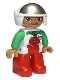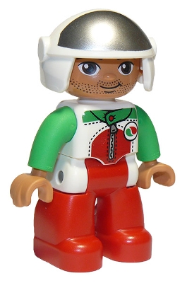 Duplo Figure Lego Ville, Male, Red Legs, Race Top with Zipper and Octan Logo, White Helmet, Oval Eyes |