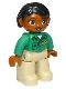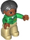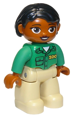 Duplo Figure Lego Ville, Female, Tan Legs, Green Top with 'ZOO' on Front, Brown Head, Black Hair, Brown Eyes, Oval Eyes |