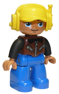 Duplo Figure Lego Ville, Male, Blue Legs, Brown Vest with Zipper and Zippered Pockets, Yellow Cap with Headset, Oval Eyes |