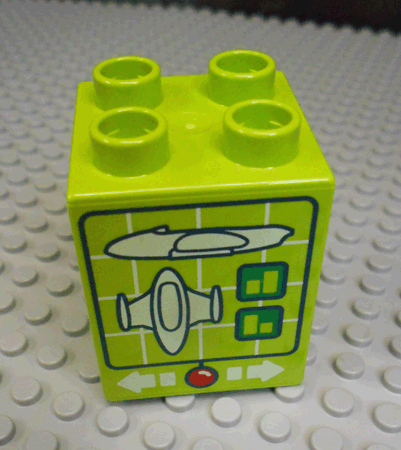 Duplo, Brick 2 x 2 x 2 with Computer Screen with Spaceship and White Arrows and Red Button Pattern |