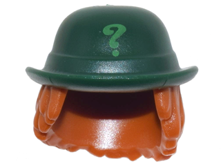 27160pb01 Minifigure, Hair Combo, Hat with Hair, Bowler Hat with Bright Green Question Mark and Dark Orange Wavy Shoulder Length Hair Pattern 1 Dark Green Non Non Non