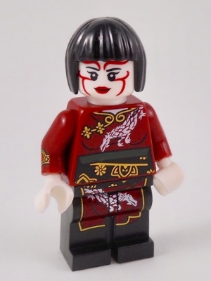Minifigure, Head Dual Sided Female Black Eyebrows, Eyelashes, White Band Across Eyes, Red Lips and Ninjago Logogram Letter H, Lopsided Grin with Dimple / Angry Bared Teeth Pattern |