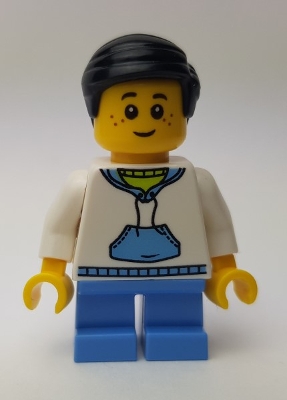 Child - Boy, White Hoodie with Medium Blue Pocket, Medium Blue Short Legs, Black Hair, Freckles |