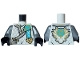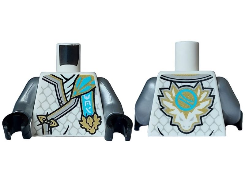 Torso Tunic with Light Bluish Gray Hems, Gold Trim, Light Aqua Shirt, Ninjago Logogram 'MOI', Medium Azure Letter Z in Dragon Head on Back Pattern / Flat Silver Arms / Black Hands |